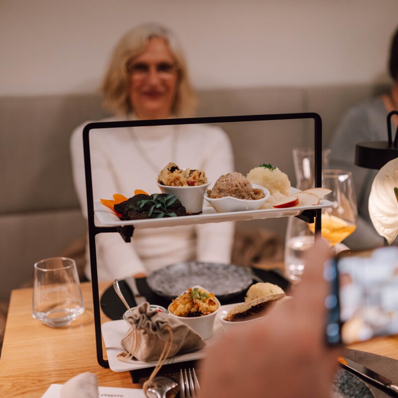 Eine Hommage an den Hunsrück: von herzhaftem Schales und gefüllten Klößen mit Specksoße über zarten Soonwälder Hirschrücken bis hin zu Kartoffelwurst mit Sauerkraut – auf unserer liebevoll kreierten Etagère zum Teilen, zu zweit oder in der Runde. Alle Rezepte stammen von Familien aus unserer Region und schmecken wie bei Oma.